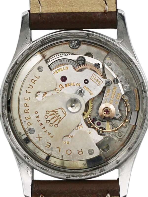 当時の最初期はカレンダー表示付きに対するモデルネームは無く、1950年代から「DATE」「DATEJUST」と文字盤にネームが入れられるようになりました。この時計はセミバブルバックキャリバーの次世代キャリバー1030系の後期キャリバーでバランスホイール受けのブリッジに緩急針を設けないハイグレードキャリバーとなっており、文字盤もギョウシェ彫仕様で後の自動巻き「デイト」モデルはオイスターパーペチュアル「DATE」のレタリング形式ですが、敢えてオイスター「DATE」パーペチュアルとプリントされている点など自動巻きカレンダー付きモデルの通常の仕様との違いを強調するかのような文字盤仕様となっております大変珍しい時計の一つかと思います。全体に経年変化は見られますが、当時のままのオリジナルコンディションとなっております。