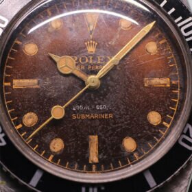 この時計は1950年代に最初に作られた200m防水モデル、REF.6200の後継機種で1950年に完成しました両回転巻き上げローターのキャリバー1030搭載の200m防水のセカンドモデル、REF.6538となります。 この時計を一躍有名にしらしめたのは何と言っても1962年に封切られた映画007のショーンコネリーが着用した事に因り、映画共々後世に語り継がれるようになりました。 文字盤に若干の経年の劣化が見られますが、かなりブラウンに焼けており、当時のままのアンティークテイストに満ちたオリジナルコンディションとなっております。 ケースは厚みの残ったとても良い状態で、ベゼルに関しましてはベゼルディスクは各数字の0(ゼロ)のコーナーに丸みのあるこのモデルの正規交換用となっております。 ブレスレットはオイスターリベットエキスパンションブレスレットとなっておりますが、バネが均一でとても良いコンディションとなっております。