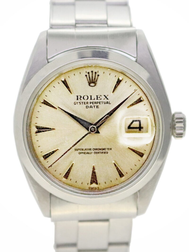 このモデルは1962年製造の初期に作られた自動巻き「DATE」モデルでシルバー系のダイヤルですが、通称”ビッグROLEX”と呼ばれるロレックスのプリントが大き目で幅が広いプリント形式となっておりとても珍しいダイヤルプリントとなります。 また、針・文字盤にも夜光塗料を含まない文字盤仕様となります。 この時計はケースもケースエッジがシャープな厚みが十分残ったとても良い状態で、文字盤も珍しい仕様のものでブレスレットもリベットブレスの状態の良い全体にとても良いコンディションとなっております。